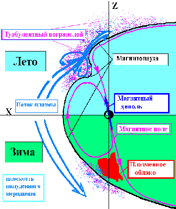 Несмотря на близкие масштабы и спектральные характеристики, топологии "застойных зон" над летним и зимним каспами отличны друг от друга. Летом (при положительном угле наклона геомагнитного диполя, т.е. к Солнцу) горловина каспа открыта для прямого взаимодействия потока плазмы переходной области с магнитопаузой, имеющей форму выступа над каспом. Причем и "застойная зона", и турбулентный погранслой на ее внутренней границе располагаются большей частью вне магнитосферы. Зимой (отрицательные углы наклона диполя) гладкая магнитопауза, расположенная почти вдвое дальше от Земли, не является жесткой преградой для развитой турбулентности, включая "диамагнитные полости". Магнитопауза становится толще и совпадает с границей обтекающего потока. Прямо под ней регулярно встречаются "плазменные шары" ('plasma balls') - полости с почти размагниченной нагретой плазмой из переходной области размером в несколько радиусов Земли. Мы считаем, что микропересоединение флуктуирующих полей и просачивание плазмы сквозь структурированную магнитопаузу наиболее эффективны для наполнения "плазменных шаров". Глобальное пересоединение, как основной источник плазмы в них, не согласуется с нашими данными.