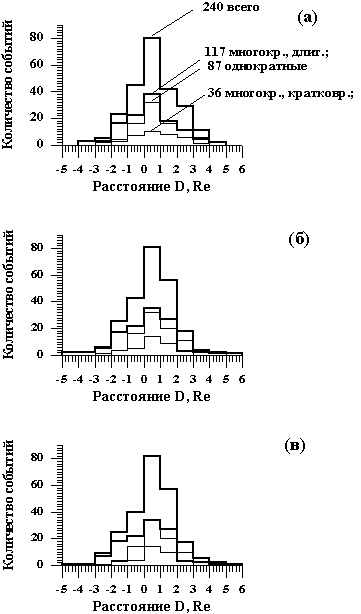 Проведено статистическое исследование транзиентных плазменных структур, наблюдавшихся в пограничной области плазменного слоя хвоста магнитосферы Земли (X~-20Re, данные Инербола-1) и вблизи высокоширотной границы плазменного слоя в авроральной области на высотах ~3Re (данные Интербола-2) в период 1995-1998г.г. К таким структурам, прежде всего, относятся короткие высокоскоростные (10-30кэВ) пучки ионов (бимлеты), генерируемые в токовом слое в дальних областях хвоста и движущиеся к Земле вдоль силовых линий магнитного поля. Статистически исследованы пространственные распределения бимлетов в хвосте и в авроральной области. Методом наложения эпох установлено, что в хвосте магнитосферы бимлеты локализованы в области между плазменным слоем и высокоширотной частью хвоста, размер которой в направлении оси ZGSM составляет 0.6Re. Применяя этот же метод к авроральным данным, удалось определить, что следы бимлетов, высыпающихся в авроральной области регистрируются вблизи высокоширотной границы плазменного слоя в пределах интервала широт ~0.80, что хорошо соответствует результату, полученному для событий, наблюдаемых в хвосте.