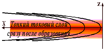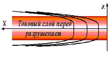 Исследована теоретическая модель самосогласованного тонкого токового слоя (ТТС) - плазменной структуры, с помощью которой могут происходить накопление и высвобождение электромагнитной энергии в магнитосфере. Динамика таких слоев зависит от различных макро- и микро- неустойчивостей. Был рассмотрен особый, эволюционный, механизм разрушения ТТС, связанный с процессами рассеяния ионов на спейсеровских орбитах, которые пересекают нейтральный слой и поддерживают основной ток в ТТС. Рассеяние обусловлено неадиабатическим эффектом - скачками адиабатического инварианта Iz. Рассеяные частицы переходят на квазизахваченные около слоя орбиты. При этом существенного изменения характерной толщины слоя не происходит. Локальный ток квазизахваченных ионов, в силу их нелинейной динамики, направлен в центре слоя противоположно току спейсеровских частиц, в то время как полный ток равен нулю. В результате накопления рассеянной плазмы в слое может произойти существенное сокращение плотности тока в центре, т.е. деградация, или "старение", токового слоя. При этом происходит изменение эффективного параметра квазиадиабатичности, пропорционального радиусу кривизны силовых линий. Это приводит, в свою очередь, к установлению положительной обратной связи между количеством квазизахваченных частиц в слое и скоростью рассеяния в ТТС. В конечном счете, накопление большого количества рассеянной популяции ионов, приводит к нарушению равновесия системы, т.е. самосогласованные решения перестают существовать. Такой новый механизм эволюции ТТС, показанный в рамках одномерной модели, дает разумные оценки времени жизни ТТС - 20-40 минут, что сопоставимо с длительностью фазы накопления суббури. Показано также, что функции распределения ионов в ТТС демонстрируют четкое разделение областей пролетных и захваченных частиц в фазовом пространстве. Эти характерные функции распределения могут быть использованы для идентификации различных этапов "старения" ТТС в процессе экспериментальных измерений.