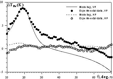 Сравнение экспериментальных результатов с моделью показывает качественное согласие, получаемых контрастов радиояркостной температуры с теоретическими расчетами. В эксперименте наблюдались резонансные эффекты, предсказанные теорией "Эткина-Кравцова" (Рис.2). В то же самое время, существует сдвиг в 1-2 K между расчетными и измеренными контрастами яркости на вертикальной и горизонтальной поляризациях. Среди возможных причин такого расхождения быть изменчивость ослабления атмосферы, изменение температуры и уровня воды за счет испарения за время измерений.