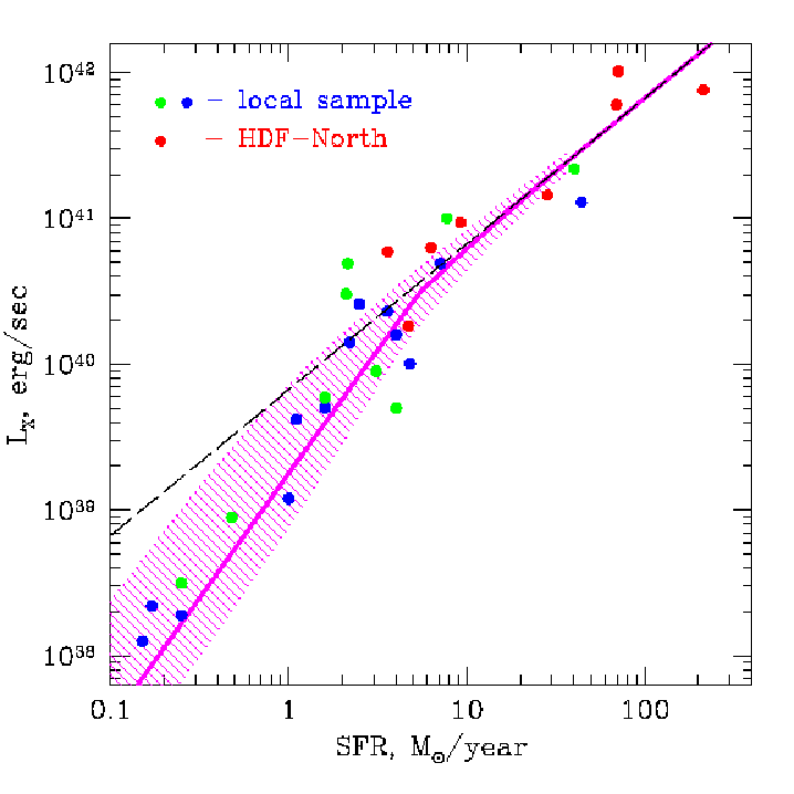 На основе наблюдений нашей Галактики, Магеллановых Облаков и близких галактик с интенсивным звездообразованием обсерваториями CHANDRA, ASCA, RXTE и МИР/КВАНТ исследована связь популяции аккрецирующих черных дыр и нейтронных звезд в массивных рентгеновских двойных с процессами звездобразования. Показано, что распределение массивных рентгеновских двойных по светимости в рентгеновском диапазоне описывается универсальным законом -- степенным распределением с наклоном 1.6, обрывающимся на светимости lg(LX) ~ 40.5 (эрг/сек), нормировка которого прямо пропорциональна темпу звездообразования в рассматриваемой галактике. Существование универсальной функции светимости позволяет использовать количество и/или интегральную светимость массивных рентгеновских двойных в галактиках для измерения темпа звездообразования как в локальной Вселенной, так и в удаленных галактиках, расположенных на больших красных смещениях. Применимость этого метода на больших красных смещениях проверена на основе наблюдений галактик с высоким темпом звездообразования в глубоких обзорах неба, выполненных обсерваторией CHANDRA.