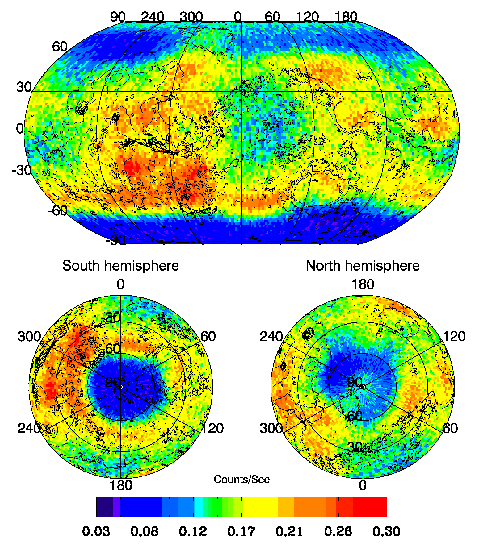 Эти результаты получены на основе обработки данных измерений российского детектора нейтронов высоких энергий ХЕНД, созданного в Институте космических исследований. Приведенная карта потока над-тепловых нейтронов от Марса отображает огромные районы "вечной мерзлоты" на высоких широтах с содержанием свободного водяного льда около 35% по массе (синий цвет) и также области с высоким содержанием химически связанной воды около 5-10% по массе (зеленый цвет). Черные линии соответствуют рельефу поверхности Марса по данным аппарата "Марс Глобал Сервейор".