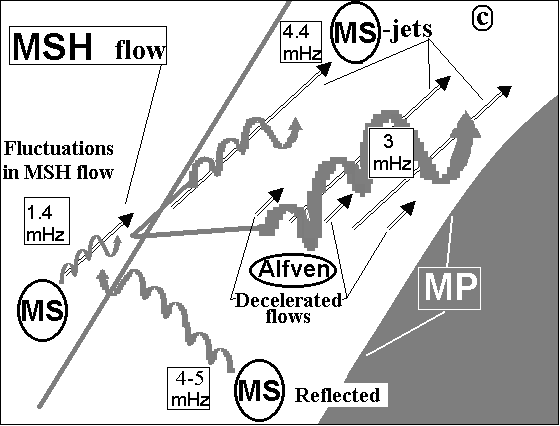 Рис. 1. . Схема взаимодействия магнитозвуковых волн (MS, 1.4 mHz) в потоке плазмы (MSH flow) с отраженными от магнитопаузы (MP) магнитозвуковыми волнами (MS, Reflected 4-5 mHz) с образованием ускоренной магнитозвуковой струи (MS-jet, 4.4 mHz) и замедленных альвеновских потоков (Alfven, 3 mHz). |