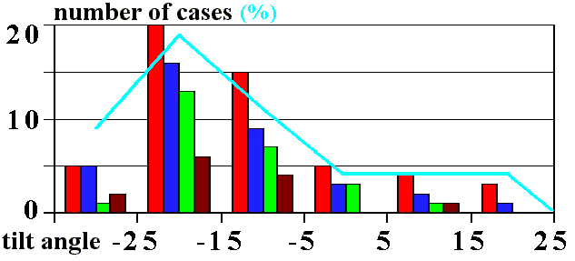 Рис. 2. Зависимость появления “плазменных шаров” от угла наклона геомагнитного диполя: полное количество случаев (красный цвет), случаи, подтвержденные энергичными электронами (>30 кэВ, синий цвет), большой угол поворота магнитного поля (зеленый цвет) и поле в магнитослое Bz < 0 (коричневый цвет). Голубая линия – вероятность наблюдения в % от числа пересечений турбулентного погранслоя. |