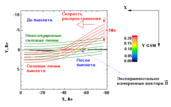 Схематическое изображение возмущения магнитного поля в форме “колена” в плоскости XY (красные линии), которое распространяется вместе с бимлетом в ПОПС вдоль силовых линий невозмущенного магнитного поля (зеленые линии). Цветными черточками изображены экспериментально измеренные вектора магнитного поля в проекции на плоскость XY, цвет черточек показывает плотность частиц высоких энергий (указывает начало и конец бимлета).