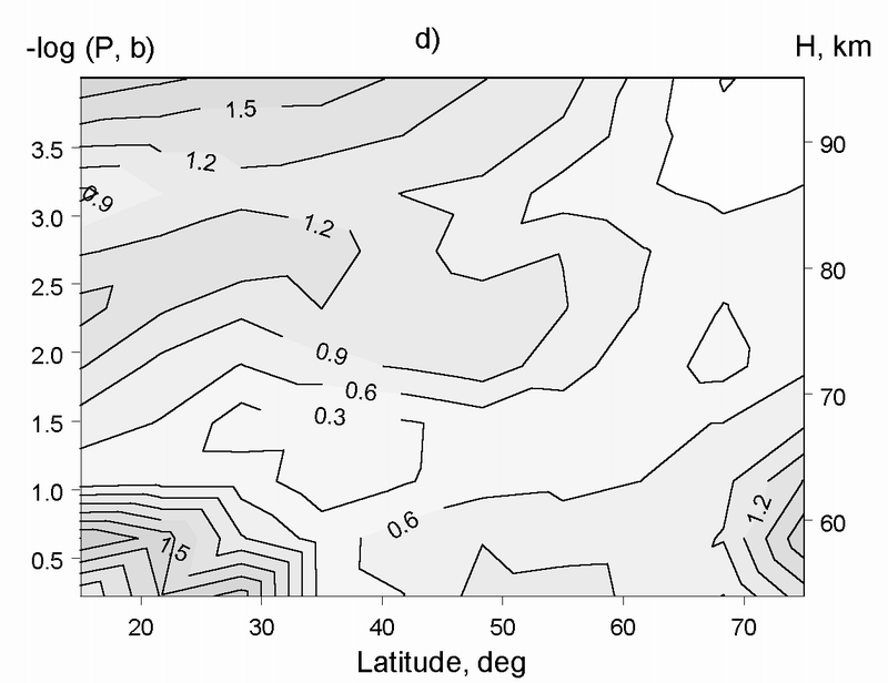 T1 , (b) Амплитуда волны с периодом 1/2 сут. T2, (c) Амплитуда волны с периодом 1/3 сут., T3. (d) Амплитуда волны с периодом 1/4 сут., T4 . Пpиблизительные значения высоты дана справа по оси y.Области заметной активности всех 4 гармоник термического прилива расположены в низких широтах выше 80 км и в верхнем облачный слое (там, на высотах 58-70 км, усваивается около 50% всей солнечной энергии, поглощенной Венерой), а на высоких широтах это– холодный воротник.