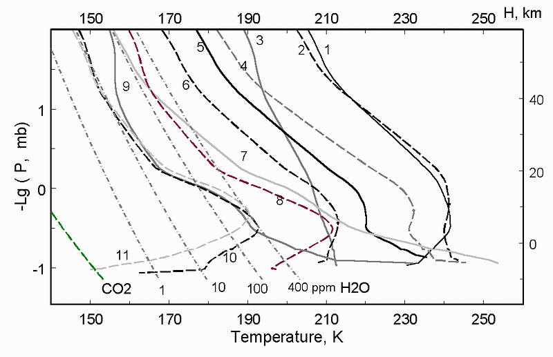 Была продолжена работа с данными IRIS Mariner 9. Кроме того, что эти данные представляют научный интерес (до сих пор они детально не изучены), спектральный интервал и спектральное разрешение интерферометра IRIS практически совпадает с этими параметрами Планетного Фурье спектромерта (ПФС ), который установлен на борту Марс Экспресс, который достигнет Марса в конце декабря 2003 года. В результате эксперимента IRIS были получены высококачественные спектры, которые дают возможность восстанавливать температурные профили в атмосфере Марса до 55 км с точностью несколько Кельвин и вертикальным разрешением несколько километров.Было проведено исследование теплового режима в области Hellas, во время затухания глобальной пылевой бури 1971-1972. На рисунке показано изменение температурного профиля в атмосфере с уменьшением оптической толщины пыли (от 1.5 при Ls=293° до 0.3 при Ls = 350°). При τ 9μ = 1-1.5 разность температур между LT = 15:20 (2) и 6:30 (3) составляет 30К на высоте 20 км и приблизительно равна разности температур у поверхности – пыль поглощает солнечное излучение днем и излучает ночью, что и приводит к нагреванию днем и охлаждению ночью. При Ls=330° разность температур между LT = 12:30 (7) и 6:50 (8) на высоте 20 км меньше 10 К, тогда как температура поверхности отличается на 60 К (τ < 0.5). Температурный профиль (9) при Ls=350°, LT = 10:40, τ = 0.3 показывает, что при fH2O = 20 ppm конденсационные облака могут наблюдаться на высотах 20-40 км. При Ls= 44 и 55°, LT = 8:00 и 4:50 (10,11) при fH2O = 10 ppm конденсационные облака могут наблюдаться на высотах 40 - 50 км. В случае Ls= 55°, LT = 4:50 (11) температура поверхности достаточно низкая для конденсации CO2.