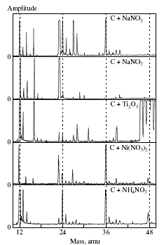 На рисунке представлены массовые спектры для мишеней, представляющих смесь углеродного порошка с различными солями и окислами, указанными на спектрах. Массовые пики обнаруженных экспериментально в спектрах полиатомных ионов и их интерпретация приведены в таблице: