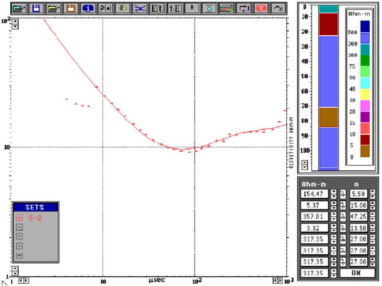 На рисунке представлен пример реальной кривой зондирования на полигоне измерений. В правой части рисунка представлены результаты решения обратной задачи для данного геоэлектрического разреза, которые позволяют определить структуру разреза – два водоносных горизонта: от 5 до 15 метров,и второй слой от 50 до 70 м, и степень минерализации каждого слоя ( его соленость) порядка 2000- 2500 мг/Л.