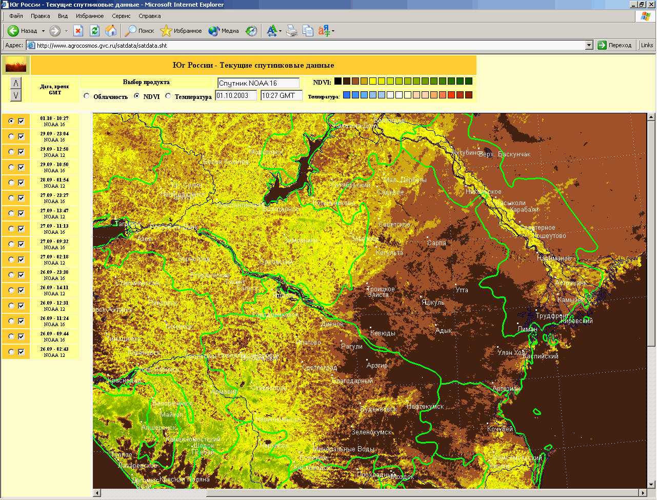 NOAA, Terra, Aqua, Spot, Landsat и Метеор 3М. Разработанные технологии и методы обработки этих данных позволили в 2003 году приступить к работам по созданию промышленных систем спутникового мониторинга состояния растительного покрова для решения прикладных задач. Так совместно с ГВЦ Министерства сельского хозяйства РФ (МСХ РФ) был создан действующий макет автоматизированной системы сбора, обработки и интеграции в отраслевую ИС данных спутникового мониторинга сельскохозяйственных районов. В рамках этих работ был организован постоянный спутниковый мониторинг Ростовской области и разработаны методики построения оперативных оценок состояния сельскохозяйственных земель. Планируется что разработанная система и методики будут использованы для построения системы спутникового мониторинга селькохозяйственной деятельности в интересах МСХ РФ.