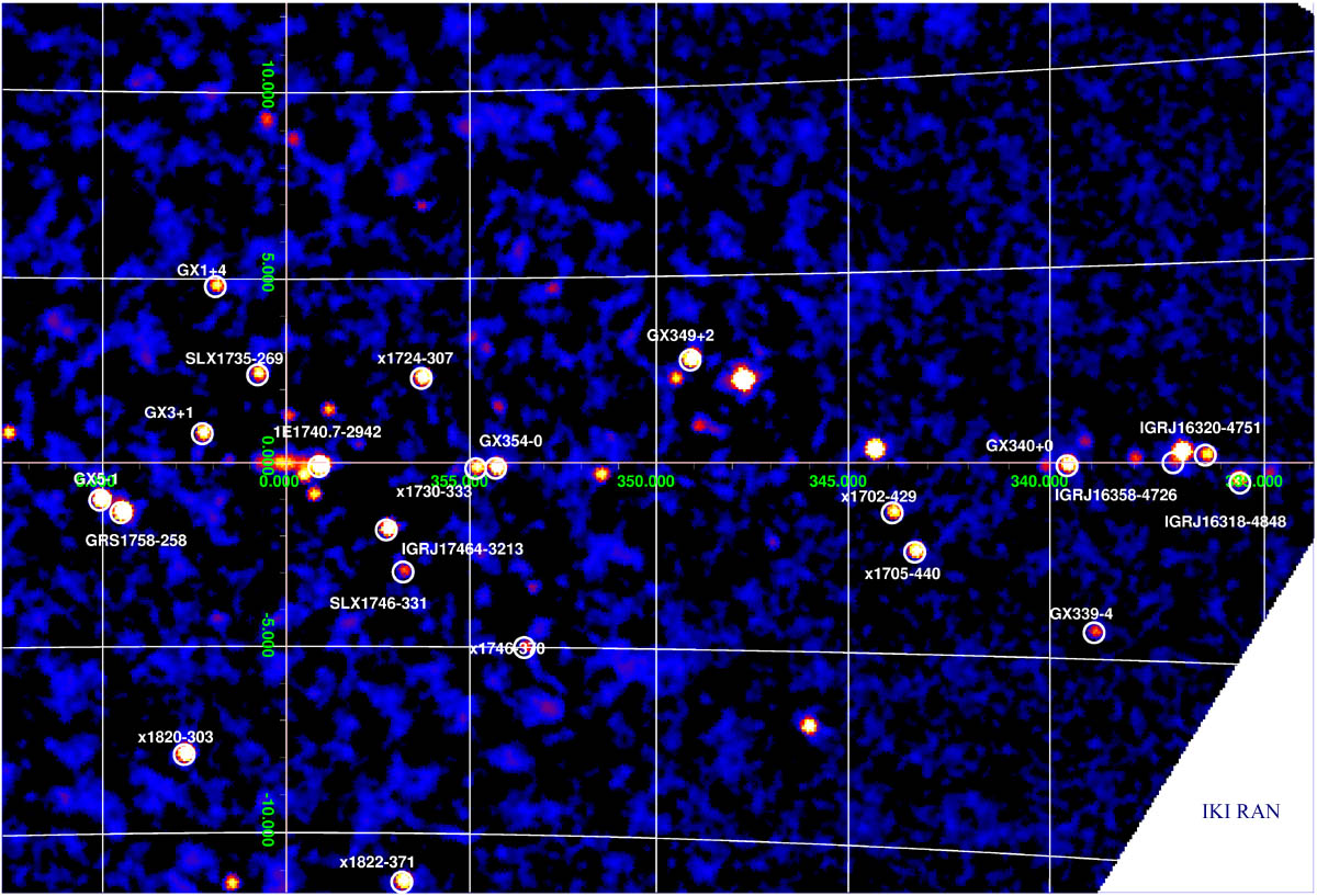 На рис.1 приведена рентгеновская карта неба, полученная в апреле 2003 г. во время наблюдений центра Галактики в диапазоне 15-40 кэВ, на которой можно видеть некоторые из новых и известных источников. |