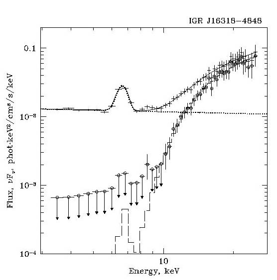 На рис.2. показан спектр одного из источников, принадлежащего к новой популяции источников, открытой по данным обсерватории ИНТЕГРАЛ, - рентгеновского источника IGR J16318-4848, находящегося в плотной оболочке |