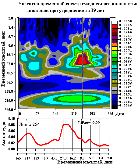 Обнаружена 27-дневная периодичность во временной последовательности интенсивности глобального тропического циклогенеза. При помощи спектрального (вейвлет) анализа временных рядов ежедневного количества циклонов получено, что глобальный циклогенез имеет свои собственные временные масштабы. В пространственно-временных спектрах годовых рядов отклик глобального циклогенеза на внешнее воздействие с 27-дневным периодом наблюдается на частотах близких к этой вынуждающей частоте. В спектрах, усредненных за 19 лет, наиболее яркой компонентой является S = 27 дней (рис. 1).