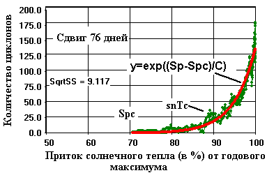 (2) Существует критический уровень притока солнечного тепла (~70% от годового максимума), выше которого интенсивность циклогенеза возрастает экспоненциально с