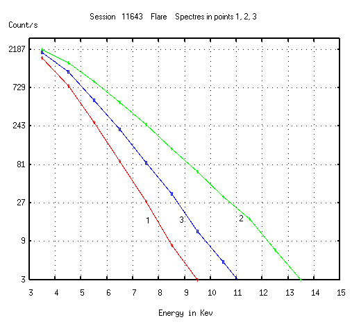 В качестве примера ниже приведены рисунки, на которых показана вспышка класса С 1.0, зарегистрированная прибором РПС-1. Спектр излучения приведен на рис.П1. Показана эволюция спектра вспышки в моменты, соответствующие началу(1), максимуму(2) и спаду(3) (по данным аппаратуры спутника GOES ). Как видим, имеется подобие спектров для различных стадий эволюции вспышки. Кроме того наблюдается большая крутизна в спадании спектра с ростом энергии квантов.