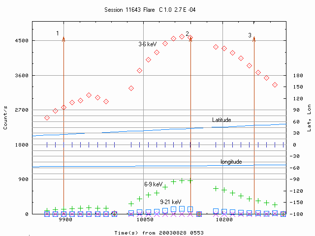 в моменты времени, соответствующие началу (1), максимуму (2) и спаду (3) излучения вспышки