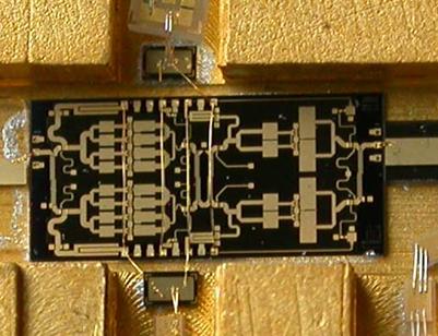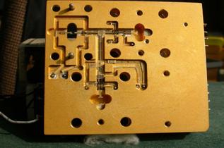 На задней стороне узлов устанавливаются стабилизаторы питания, дополнительные каскады промежуточной частоты и т.п. Связь между лицевой и задней стороной осуществляется через проходные изоляторы. В СВЧ тракте применяются монолитные бескорпусные элементы. Соединительные микрополосковые линии имеют волновое сопротивление 50 Ом и выполняются на кварцевой подложке толщиной 200 мкм. Для уменьшения потерь и обеспечения неизменности характеристического сопротивления микрополосковые линии имеют обратную металлизацию. Все элементы устанавливаются с помощью электророводного клея. Соединение элементов осуществляется методом термокомпрессии с помощью золотой проволоки диаметром 16 мкм.