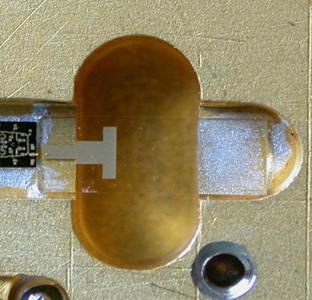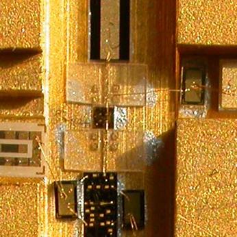 В модуляторе применены специальные P-I-N диоды, производства НИИ «Пульсар», позволяющих получить малые потери в открытом состоянии (около 0,1 дБ) и запирания более 30 дБ в закрытом состоянии. Диоды имеют металлическое основание толщиной около 50 мкм. Полупроводниковая структура создавалась на материале GaAs высотой не более 5 мкм,. Такая конструкция диода позволяет иметь малую индуктивность диода и малое последовательное сопротивление потерь, что и позволило получить малые потери и высокую развязку. Диод включен в 50 Ом микрополосковую линию передачи с необходимыми элементами согласования. На Рис.5 изображена фотография модулятора на P-I-N диоде.