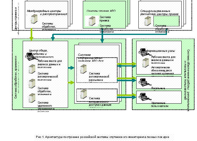 Начиная с 1996 года, в рамках различных проектов в ИКИ РАН совместно с другими организациями (в первую очередь с ФГУ «Авиалесоохрана», ЦЭПЛ РАН, ИСЗФ СО РАН, СПбНИИЛХ) проводились работы по созданию методов и технологий спутникового мониторинга лесных пожаров. На основе этих разработок в 2003 году были начаты работы по созданию информационной системы дистанционного мониторинга лесных пожаров МПР РФ (ИСДМ МПР РФ). Головной организацией по созданию системы и вводу ее в промышленную эксплуатацию стал ИКИ РАН. В 2004 году все основные элементы системы были введены в промышленную эксплуатацию. Архитектура системы представлена на рис. 1.