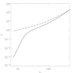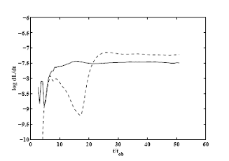 Рис.10. Эволюция полного потока углового момента через магнитосферу (сплошная линия) и через сечение z=0.6 (пунктирная линия). Полный поток через сечение z=0.6 становится постоянным прблизительно через 26 оборотов звезды. |