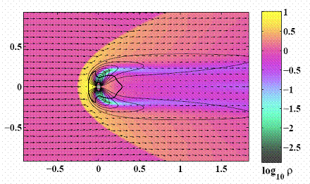 в единицах радиуса Бонди, заливкой показана плотность, длина векторов пропорциональна