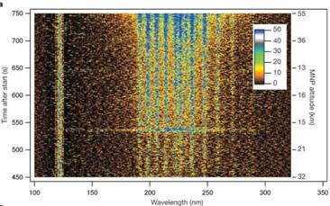 Временная зависимость интенсивности ночного свечения атмосферы Марса. Оно содержит эмиссию водорода Лайман-альфа и структурированную полосу (190–270 nm), соответствующую NO. На 535 с наблюдений наблюдается пик интенсивности, спектры которого существенно отличаются от обычного спектра NO, и содержат полосы СО и ионизованного СО2.