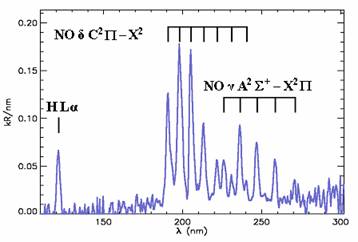 Спектр ночного свечения Марса измеренный прибором SPICAM на борту КА Mars Express. Помимо линии L на 121.6 нм, открыты новые полосы, соответствующие основным колебательным переходам NO.