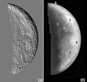 Яркость отдельных деталей поверхности Меркурия определяется как условиями освещения, так и отражательными свойствами данного участка поверхности. Из физики Луны известно, однако, что границы геологических провинций часто сопутствуют градациям яркостей. Поэтому полученные изображения, в принципе, могут содержать информацию о рельефе планеты. В 2005 г. была предпринята такая попытка восстановления рельефа Меркурия в области долгот 215-290ºW на основе обработки наблюдений 2 мая 2002 г. с помощью программы обработки, которая использовалась в работе Ксанфомалити и др., (2002). По-видимому, благодаря большому числу исходных снимков и их хорошему качеству, результат превзошел ожидания. Он показан на рис. 1 без какой-либо дополнительной обработки и ретуши. Направление условного освещения – с юго-запада. Фазовые эффекты и оттенки серого подавлены.