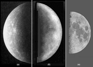 Интересно сравнить изображения, полученные методом синтеза, со снимками  аппарата МАРИНЕР-10 в целом. Такое сопоставление представляют панели а и б на рис. 2. Несмотря на то, что это совершенно разные долготы, сходство вида поверхности на них чрезвычайно убедительно. Можно заключить, что синтезированные изображения по разрешению примерно соответствуют снимкам, сделанным камерой МАРИНЕРА-10 с расстояния в 1 млн км. При одинаковой контрастности можно выделить 2-3 крупных темных района, подобных рис. 2б. Однако в целом, вид полушария  Меркурия в интервале долгот 15-190ºW, известного по съемке аппарата МАРИНЕР-10, заметно отличается от планеты в фазе 97º для долгот 215-290ºW (рис. 19б), где расположены более крупные темные области. Вместе с тем, и снимок с аппарата МАРИНЕР-10 (рис. 2а), и синтезированные изображения Меркурия гораздо больше напоминают первую четверть Луны (рис. 2в), чем широко известную и многократно публиковавшуюся мозаику снимков аппарата МАРИНЕР-10. Основная причина заключается в том, что мозаика была создана вручную (Стром и Спрегью, 2003), причем на исходных снимках контраст мелких деталей подчеркивался, а границы полей снимков требовали выравнивания. Это привело к подавлению низких пространственных частот, соответствующих крупным образованиям. Но не исключено, что есть еще одна причина. Как известно, во время работы аппарата МАРИНЕР-10 у  Меркурия было принято решение о переключении видеовыхода видиконной камеры непосредственно на модулятор радиопередатчика, из-за чего передача изображений могла выполняться только в реальном масштабе времени (Стром и Спрегью, 2003). Можно предположить, что это привело к определенному рассогласованию частотных свойств видеоканала камеры МАРИНЕРА-10. Во всяком случае, несомненно, что баланс пространственных частот мозаичных изображений искажен, как минимум, из-за ручной обработки. В то же время, совершенно очевидно сходство рис. 2 б, со снимком 2 а, сделанным камерой МАРИНЕРА-10 в начале работы у Меркурия, 29.03.1974.