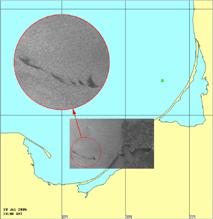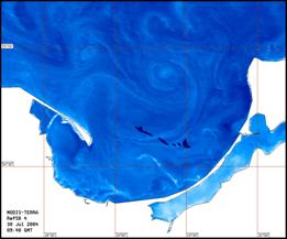динамика в Гданьском заливе, выявленная на оптическом изображении MODIS-Terra (разрешение 250 м), полученном 30 июля 2004, 09:40 GMT. Черные пятна соответствуют положению нефтяных загрязнений, обнаруженных