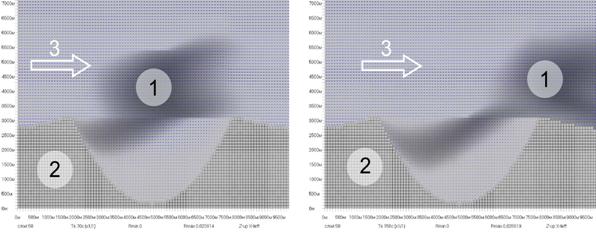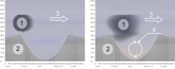 неоднородной подстилающей поверхностью в момент времени 2 с.