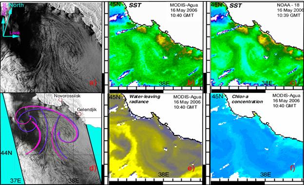 На рисунке показан пример использования мультисенсорного подхода к изучению вихревой активности в прибрежной зоне Черного моря.