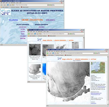 В рамках работы по проекту INTAS-03-51-4987 “Слики как индикаторы морских процессов” создана коллекция изображений морской поверхности, полученных различными спутниковыми, самолетными и наземными приборами дистанционного зондирования. Коллекция оформлена в виде интернет сайта (http://www.iki.rssi.ru/simp/). Основное ее назначение – дать представление о том, каким образом наличие пленок биогенных и антропогенных поверхностно-активных веществ на морской поверхности может способствовать обнаружению и идентификации физических и биологических процессов и явлений в приповерхностном слое атмосферы и океана с помощью сенсоров, работающих в микроволновом и оптическом диапазонах. Это определяет структуру коллекции, рубриками которой стали физические и биологические явления, которые проявляются на изображениях посредством сликов. Для каждого изображения приводятся все имеющиеся сведения о параметрах и условиях съемки, включая метеорологические, гидрологические, батиметрические и другие сведения, данные совместных контактных и других дистанционных измерений, а также прилагаются ссылки на публикации, в которых это изображение обсуждается.