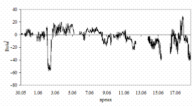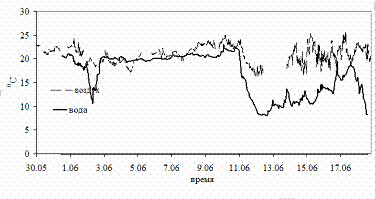 На Рис. 2 представлены температура воды и воздуха, а также рассчитанный прямым методом турбулентный поток тепла за все время измерений. Резкое уменьшение потока 2-3 июня связано, прежде всего, с локальным апвелингом. Большое абсолютное значение потока связано со значительной (до 25 м/с) скоростью ветра. В период 17-18 июня при отрицательной разнице температур вода-воздух наблюдался положительный поток тепла. Вероятно, это связано с образованием в результате дневного прогрева теплой поверхностной пленки, что подтверждается данными дистанционного зондирования в ИК диапазоне. В настоящее время проводится корреляционная обработка данных прямых измерений потоков тепла и импульса с данными микроволнового радиометрического зондирования морской поверхности.