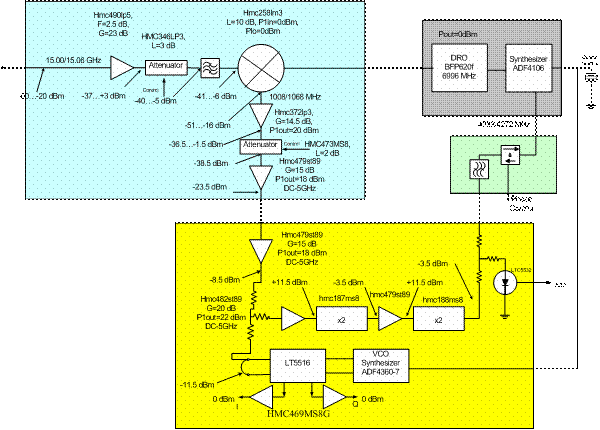 Приемник скаттерометра строится по супергетеродинной схеме с малошумящим усилителем на входе. Для реализации когерентного режима необходимо синхронизовать с точностью до фазы гетеродин приемника с задающим генератором. Для этой гетеродин приемника выполняется перестраиваемым напряжением (VCO) [2], и реализуется петля захвата фазы управляемого генератора от задающего генератора (PLL). PLL управляет частотой гетеродина приемника таким образом, что разность частот задающего генератора и VCO равняется 600 МГц, а флуктуация относительной фазы между этими связанными генераторами не превышает 0,3 градуса (rms). Разностная частота 600 МГц выделяется на смесителе сравнения, на который поступают сигналы задающего генератора и VCO, и используется для работы схемы PLL.
