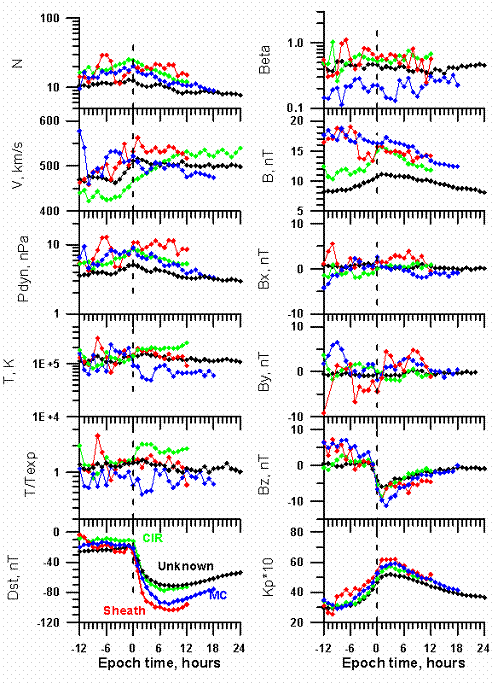 Поэтому в данной серии работ изучаются условия в солнечном ветре раздельно для Sheath, МС и CIR, приводящие к бурям. С этой целью на основании базы данных OMNI проводится исследование временного хода параметров солнечного ветра и межпланетного магнитного поля для 623 магнитных бурь в период 1976-2000гг. Анализ проводится методом наложения эпох (за начало эпохи взято время начала магнитной бури) для 5 различных категорий бурь, возбужденных различными типами солнечного ветра: CIR (область сжатия в интерфейсе быстрого и медленного потоков – Corotating Interaction Region) – 121 буря, Sheath (область сжатия между невозмущенным солнечным ветром и телом магнитного облака) – 22, MC (магнитное облако) – 113 и “неопределенный тип” – 367, а так же для «всех бурь» - 623 бури. Полученные данные (см. рисунок), с одной стороны, подтверждают полученные ранее результаты без селекции интервалов по типам солнечного ветра, а с другой стороны, указывают на имеющиеся различия в ходе параметров для различных типов солнечного ветра. Хотя наименьшие значения Bz компоненты ММП наблюдаются в МС, наименьшие значения Dst индекса достигаются в Sheath. Таким образом, наибольшие магнитные бури в среднем возбуждаются во время Sheath, а не во время тела МС, возможно, за счет более высокого давления и его вариаций в Sheath. Более высокие значения параметров Pdyn (nkT), T/Texp и b наблюдаются в CIR и Sheath и более низкие в МС, что соответствует физической сущности этих типов солнечного ветра. Возрастание вариаций (часовых дисперсий) концентрации и модуля ММП наблюдается за 5-10 часов до онсета только в течениях Sheath. Для бурь, связанных с CIR, Sheath и MC , зависимость между минимумом Bz компоненты ММП и минимумом Dst индекса и зависимость между электрическим полем Ey солнечного ветра и минимумом Dst индекса более крутые, чем для “неопределенного” типа солнечного ветра. Наиболее крутая зависимость Dst от Bz наблюдается в течениях типа Sheath, а наиболее крутая зависимость Dst от Ey наблюдается в течениях типа MC. Таким образом, статистический анализ показывает, что, несмотря на наличие южной компоненты ММП во всех случаях, для различных типов магнитных бурь имеются существенные различия в остальных параметрах солнечного ветра.