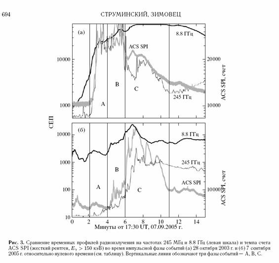 В работе (Струминский и Зимовец, 2007) были рассмотрены импульсные фазы трех мощнейших вспышек 23 цикла (28 октября 2003 г., 20 января и 7 сентября 2005 г.), которые длились ~20 минут и состояли, по крайней мере, из трех актов энерговыделения, различавшихся своим проявлением в мягком (1-8 Å, GOES) и жестком (>150 кэВ, ИНТЕГРАЛ) рентгеновских диапазонах, а также на радиочастотах 245 МГц и 8.8 ГГц.