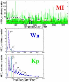 - Как известно, ряды медико-биологических показателей, и, в особенности неподтвержденные данные скорой помощи, имеют высокий уровень шумов и спектральный анализ этих рядов сопряжен обычно с затрудненным выделением компонент (см. например Halberg et al. 1991, 2003). На рис.6 вверху показан спектр внезапной смерти от инфаркта миокарда в Миннесоте МИ (1968-1995г – ежесуточные данные), полученный предложенным новым методом, и найденные спектральные компоненты сопоставлены с индексами геомагнитной (Кр) и солнечной (числа Вольфа W) активностью. Очевидно, что трудно провести сопоставление ИМ (зеленые пики - FFT спектр), в то время как спектр, полученный новым методом, выделяет тонкие пики, соответствующие гелио-геомагнитным характеристикам.