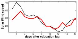 Рис.1.Предсказание (красная линия )вариаций солнечного ветра на 16 дней вперед (черная линия). Коэффициент корреляции КК= 0.86 |