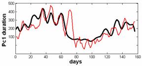 Рис.2. Предсказание суточной продолжительности Рс1 (красная линия )магнитных микропульсаций на 160 дней вперед (черная линия) |