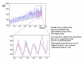 Рис.3. Прогноз внезапной смерти от инфаркта миокарда (красная кривая) в Болгарии за 25 лет (ежемесячные данные- черная кривая). |