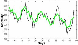 Рис.4. Прогоз внезапной смерти в Мннесоте (1968-1995г) (зеленая кривая) данные (черная кривая) |