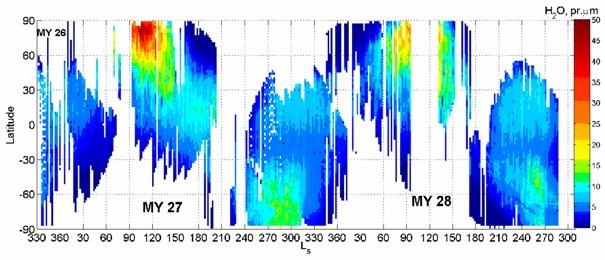 MY26) по август 2007 (Ls=287°, MY28). Сравнение максимумов водяного