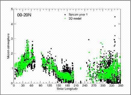 сравнению с 2005 годом, и содержание резко спадает после Ls=270. Подобная картина наблюдалась в