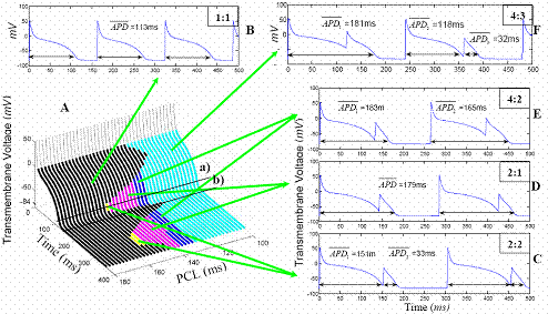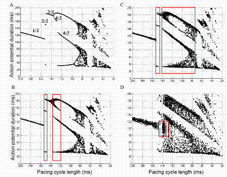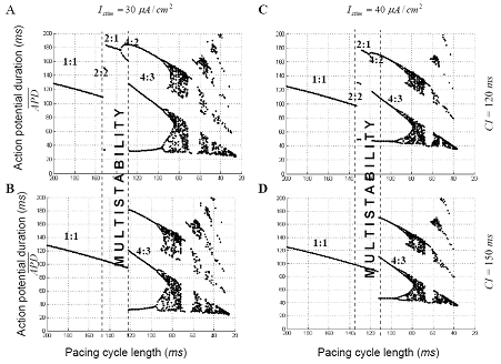 мсек)). A и B: бифуркационные диаграммы для амплитуды стимуляции: