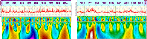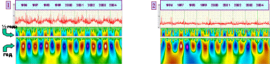 На рисунке показано изменение радиояркостной температуры (7 лет) и соответствующая картина коэффициен-тов вейвлет–преобразования, которые далее используются для построения аттрактора на разных временных масштабах.