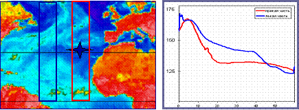 На рисунке слева показана северная часть Атлантики с выделенными для построения широтно – временной диаграммы областями. Рисунок справа демонстрирует влияние квазистационарного центра действия, Азорского антициклона (местоположение отмечено звездочкой на рисунке слева), которое проявляется резким спадом на красной кривой — перенос влаги тропическими циклонами блокируется, их траектории отклоняются.