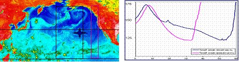 А. Широтно – временная диаграмма и кривая используются для изучения взаимосвязей между характеристиками системы океан – атмосфера на синоптических и климатических масштабах изменения. В диаграмме последовательно ото дня ко дню собирается информация (над выбранной акваторией Мирового океана) об интегральном по долготе распределении радиояркостной температуры по широте. По диаграмме за год или несколько лет строится широтно – временная кривая.