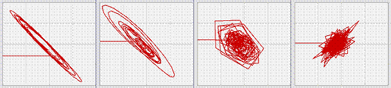 Примеры аттракторов, построенных по коэффициентам вейвлет–преобразования на некоторых временных масштабах, демонстрируют (слева направо) чисто периодическое поведение процесса на годовом масштабе, слегка усложняющееся и становящееся квазигармоническим вблизи полугода, включение колебаний порядка месяца сильно усложняет траекторию, а при включении синоптических колебаний качественно меняется характер процесса.