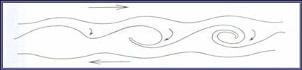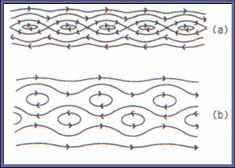 В результате могут быть получены решения в виде зонального потока, содержащего вихревую дорожку с одинаковым (а) или чередующимся (b) направлением циркуляции. Пример таких вихревых дорожек в зональном потоке показан на рисунке слева.